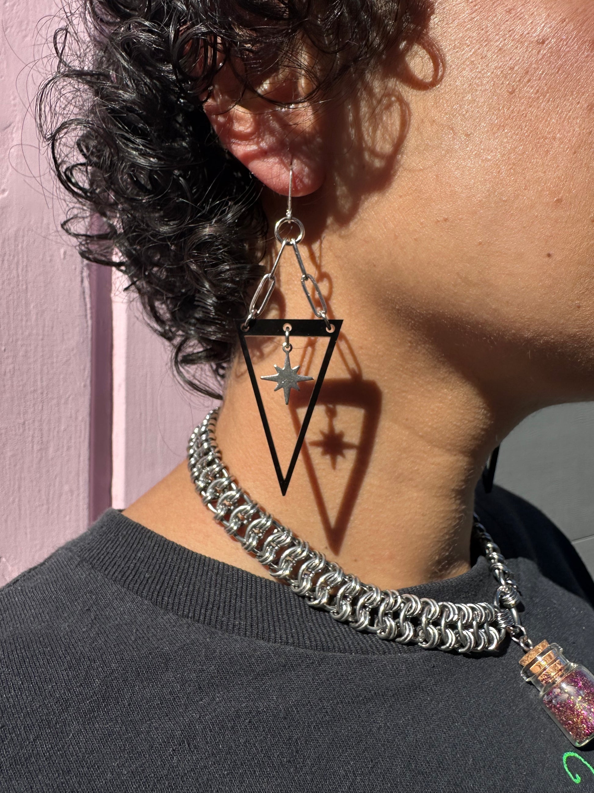 A mix of laser cut black acrylic, paperclip chain, and nickel free zinc star charms